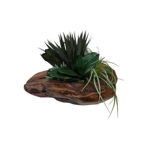 CARVED TEAK BOWL WITH SUCCULENTS + AIRPLANT + MOSS